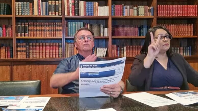 O Facebook e o Instagram retiraram do ar a live semanal do presidente Jair Bolsonaro, transmitida na última quinta-feira (21). No vídeo, que pode ser visto no YouTube, o presidente disse que um estudo no Reino Unido afirmava que 70% dos mortos com Covid estavam vacinados, mas não mostrou a fonte da informação. O presidente alertou ainda, a partir de um texto do site “Before it’s news”, que “os totalmente vacinados [contra a Covid-19] estão desenvolvendo a síndrome da imunodeficiência adquirida [Aids] muito mais rápido que o previsto”.