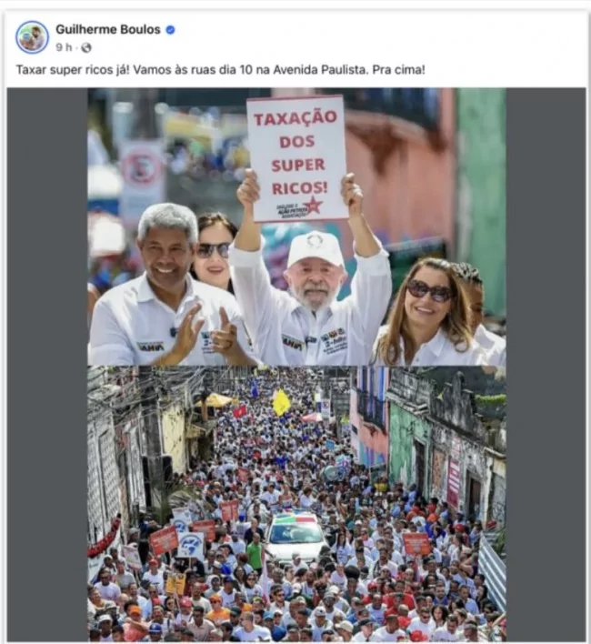 O deputado federal Guilherme Boulos (Psol-SP) convocou um ato na av. Paulista para o dia 10 de julho com o objetivo de apoiar o aumento do IOF. Uma insanidade.