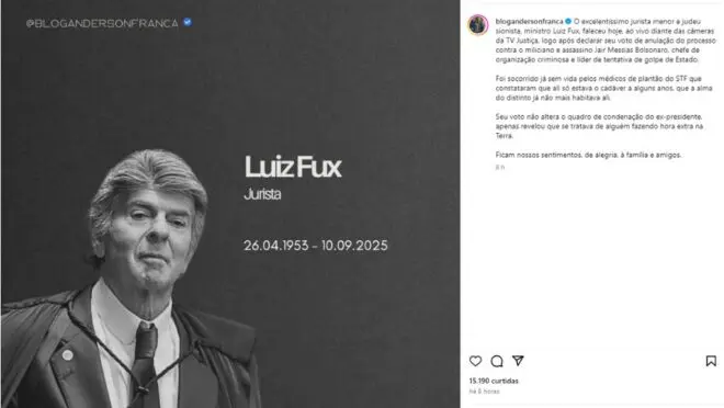 “O excelentíssimo jurista menor e judeu sionista, ministro Luiz Fux, faleceu hoje, ao vivo diante das câmeras da TV Justiça, logo após declarar seu voto de anulação do processo contra o miliciano e assassino Jair Messias Bolsonaro”, escreveu um blogueiro de esquerda com mais de cem mil seguidores.