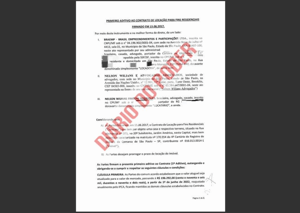 Ao menos até junho desde ano, Wilians pagava exatos R$ 196.292,00 mensais para seguir morando de aluguel na mansão de número 371 da Rua Alemanha, no bairro Jardim América, em São Paulo. O Diário do Poder teve acesso ao primeiro aditivo do contrato de aluguel do palacete, firmado em junho de 2022, prorrogando por mais três anos o compromisso mensal de quase 130 vezes o valor do salário mínimo atual.