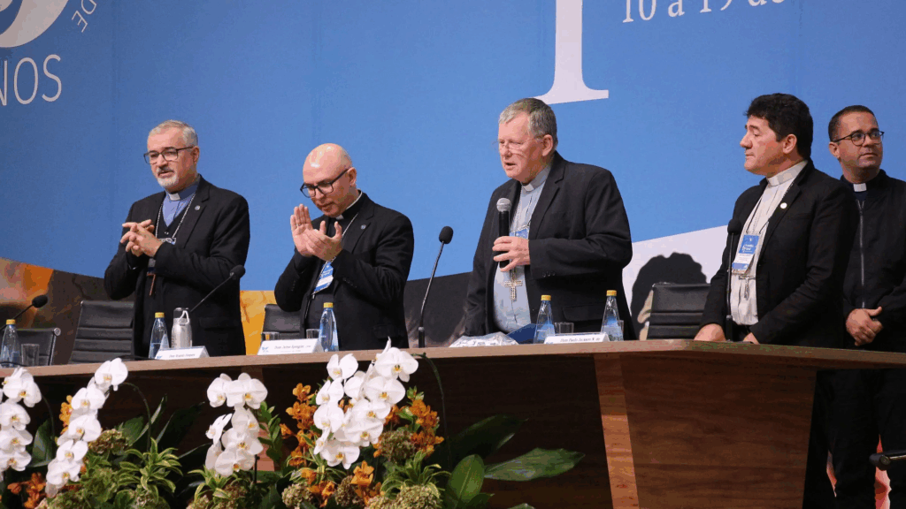 Da esquerda para a direita, dom João Justino de Medeiros Silva, primeiro vice-presidente; dom Ricardo Hoepers, secretário-geral; dom Jaime Spengler, presidente; e dom Paulo Jackson Nóbrega de Sousa, segundo vice-presidente da CNBB, em foto de 2024. (Foto: Victória Holzbach/CNBB)
