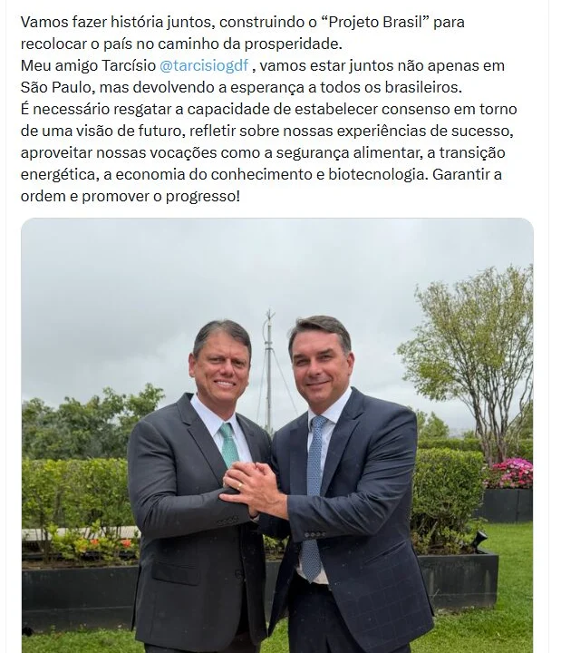 “Vamos fazer história juntos, construindo o ‘Projeto Brasil’ para recolocar o país no caminho da prosperidade”, escreveu. Ao mencionar Tarcísio, Flávio afirmou que estarão “juntos não apenas em São Paulo, mas devolvendo a esperança a todos os brasileiros”.