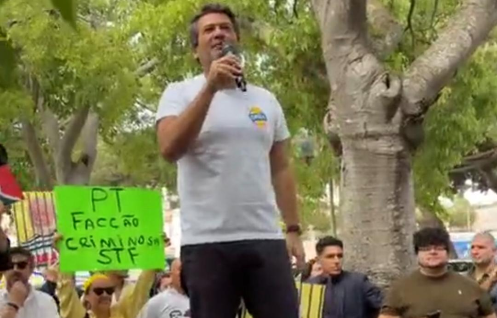 Entre as faixas levantadas durante o ato, estavam mensagens como “PT facção criminosa” e referências ao STF, em um protesto que reuniu apoiadores da direita portuguesa e brasileiros residentes no país.