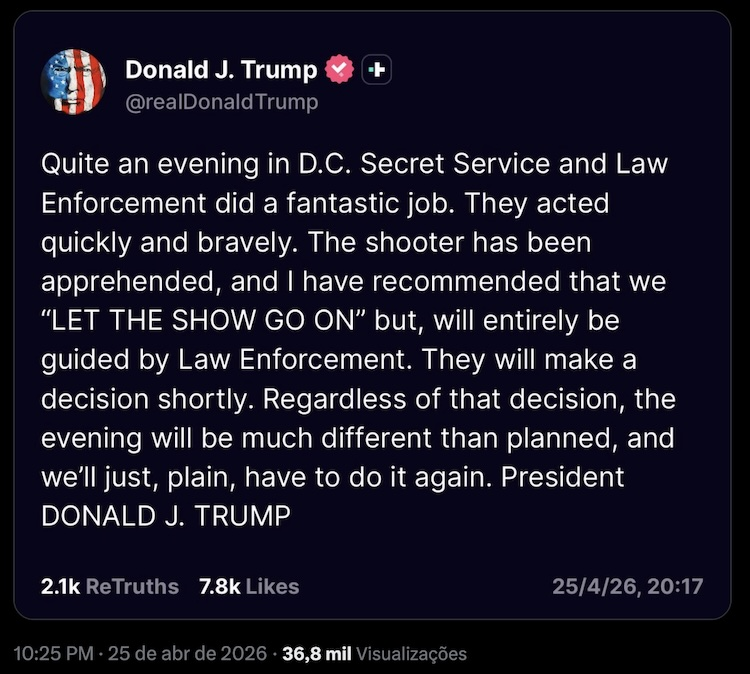 Trump se pronunciou sobre o caso em suas redes sociais, elogiando o trabalho dos agentes de segurança. “Uma noite memorável em Washington D.C.”, escreveu. “O Serviço Secreto e as forças de ordem fizeram um trabalho fantástico. Agiram com rapidez e bravura.” Depois, em coletiva, ele chamou o episódio de “momento traumático” e definiu o atirador Cole Tomas Allen, de 31 anos, como “um lobo solitário e doente”. Allen foi identificado como engenheiro, professor de escola secundária na Califórnia, e filiado ao partido Democrata, a “esquerda” americana.